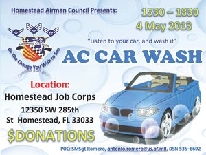 May 3, 2013 Airman's Council holds car wash May 4 The Homestead Air Reserve Base Airman's Council is holding a fundraiser car wash at the Homestead Job Corps parking lot (corner of 288th St. and 285th St.) from 3:30 p.m. to 6:30 p.m. May 4. The council is also having a bake sale at the car wash. They welcome any baked-good donations.Seeking