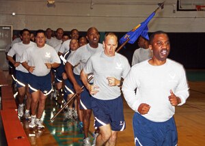 Tech. Sgt. Earlvine Fort, 482nd Force Support Squadron, Col. Donald Lindberg, 482nd Fighter Wing Commander, and Chief Master Sgt. Cameron Kirksey, 482nd FW Command Chief, leads the Noncommissioned Officer Leadership Development Course on a run early in the morning, Dec. 13.Col. Elwin Rozyskie, 482nd