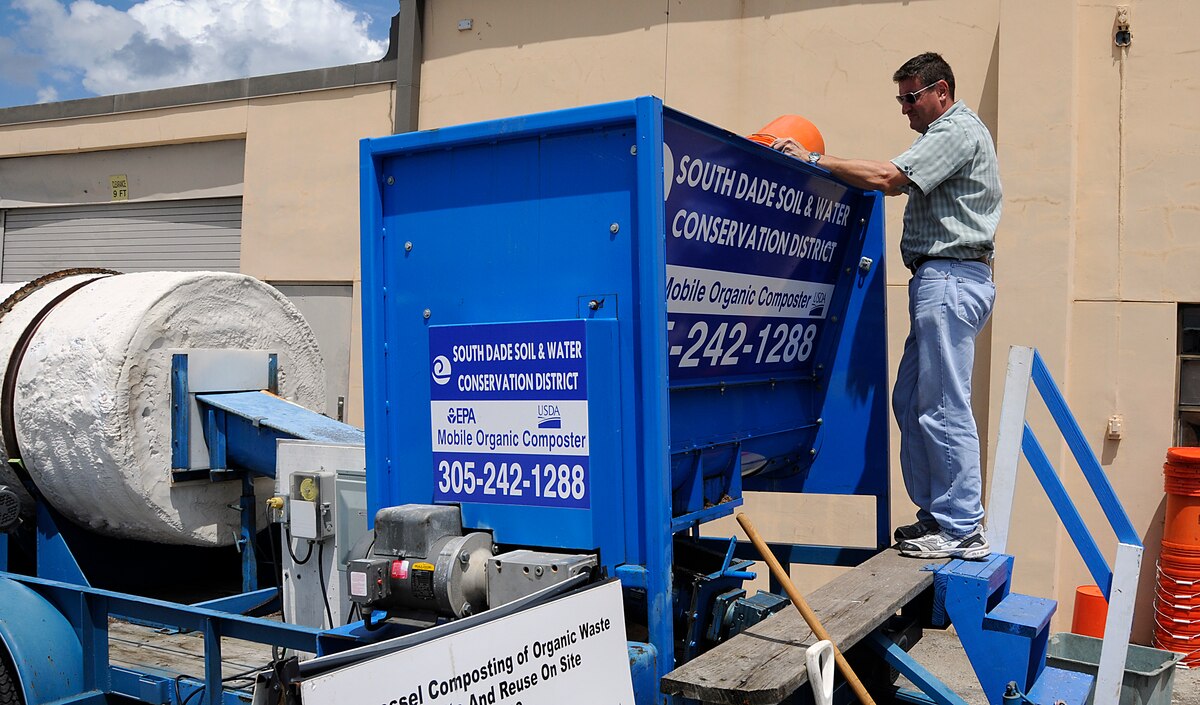 Mr. Tim Driscoll, 482nd Environmental Flight environmental protection specialist, pours food materials into the In-Vessel Aerobic Compost Machine from the South Dade Soil and Water Conservation, April 22. The machine is being tested for effectiveness of composting. (U.S. Air Force photo/Senior Airman Lou Burton)